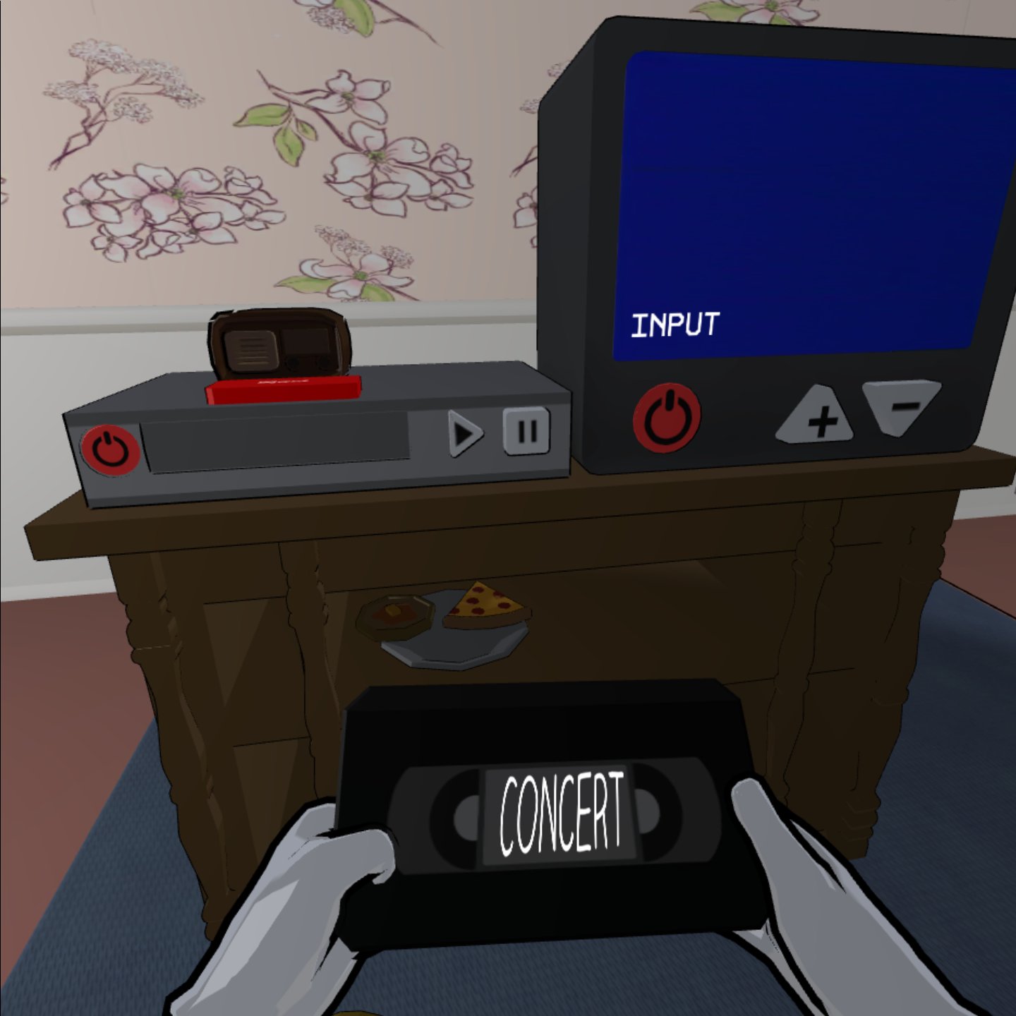 I spent most of my time on this project scripting the device behavior for the VCR and TV. We decided to simplify a lot about both device's interfaces so that the interaction was an intuitive puzzle rather than a strictly accurate emulation of how a VCR and CRT TV work. That said, I did want them to behave very predictably for people who are, in fact, familiar with the arcane box that is a VCR, so we used a couple very simple state machines to manage the behavior of both. This meant that it would perform as expected if only certain cables were attached, e.g. only audio in/out or only video in/out. The small details ended up making a big impact in practice, lots of our players appreciated the attention to detail and tactility of all our big chunky buttons and cables, useful for fumbling VR hands.
