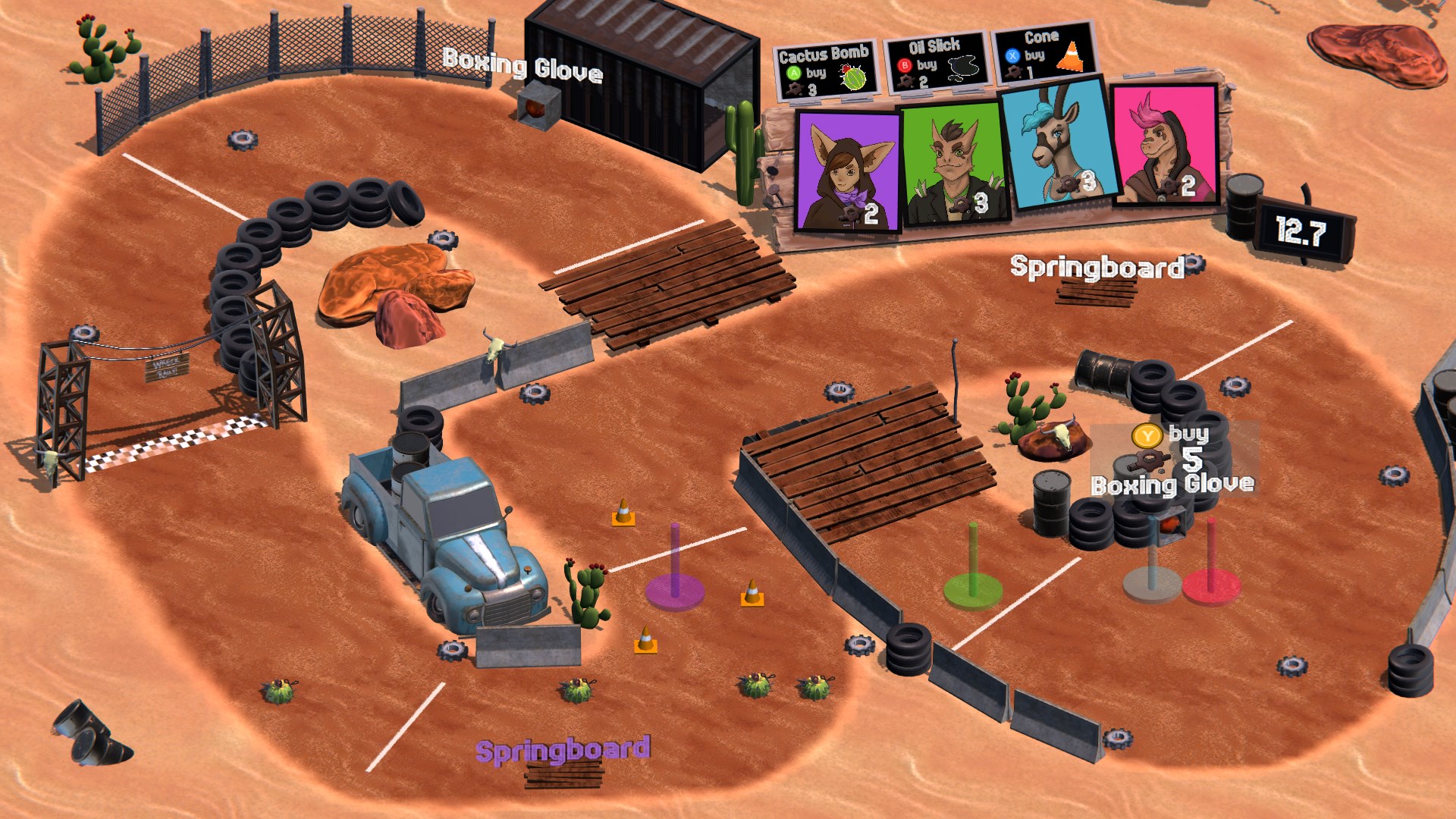 An isometric, trap-laying, cart-racing, local-multiplayer frenzy! A twist on emulating the frenetic feel of gas-powered off-road RC car racing with the added chaos of a trap-laying phase, this was a personal design pitch of mine that the rest of our team adopted for prototyping! Our two major references for the design were Ivan "Ironman" Stewart's Super Off Road arcade cabinet and the couch classic Ultimate Chicken Horse. We built and refined our prototype over the course of about seven weeks between our other classes and university capstone projects.